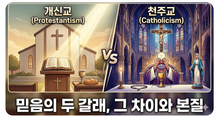 개신교와 천주교의 공통점과 차이점을 종교개혁의 역사적 기원부터 성경 권수, 구원관, 마리아 공경까지 상세히 비교 분석합니다. 기독교의 뿌리와 두 교파의 본질적 차이를 이해하기 쉽게 정리했습니다.