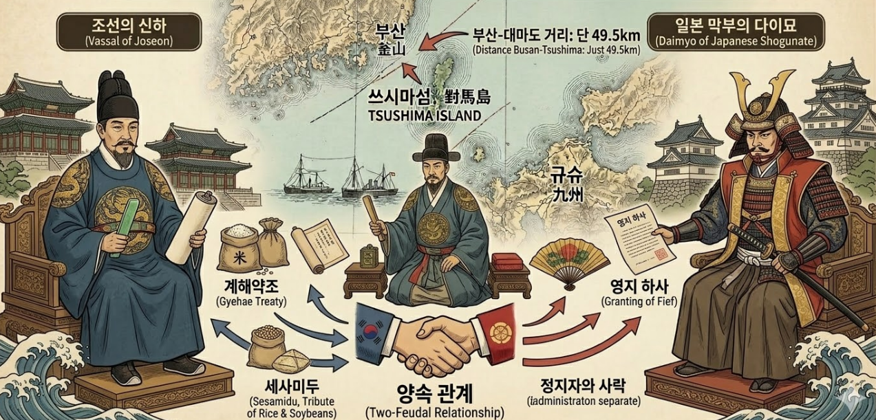 대마도는 고대부터 한반도와 일본 열도를 잇는 지정학적 요충지이자 문화 교류의 징검다리 역할을 수행해 온 곳입니다. 특히 조선 시대에 이르러 대마도는 '양속 관계(兩屬 關係)'라는 매우 독특하고 이중적인 지위를 유지했습니다. 이는 섬을 다스리던 종씨(宗氏) 가문이 생존을 위해 조선과 일본 양쪽 모두에 신하의 예를 갖추고 속해 있었음을 의미합니다. 1419년 세종대왕 시기, 이종무 장군이 이끄는 227척의 전함과 1만 7천여 명의 병력이 대마도를 정벌한 이후, 조선은 대마도를 강력한 군사적, 경제적 통제 아래 두었습니다. 1443년 체결된 계해약조를 통해 조선은 대마도주에게 매년 쌀과 콩 200석(세사미두)을 하사하고, 50척의 무역선(세견선) 왕래를 허락하며 그들의 경제적 명줄을 쥐고 있었습니다.