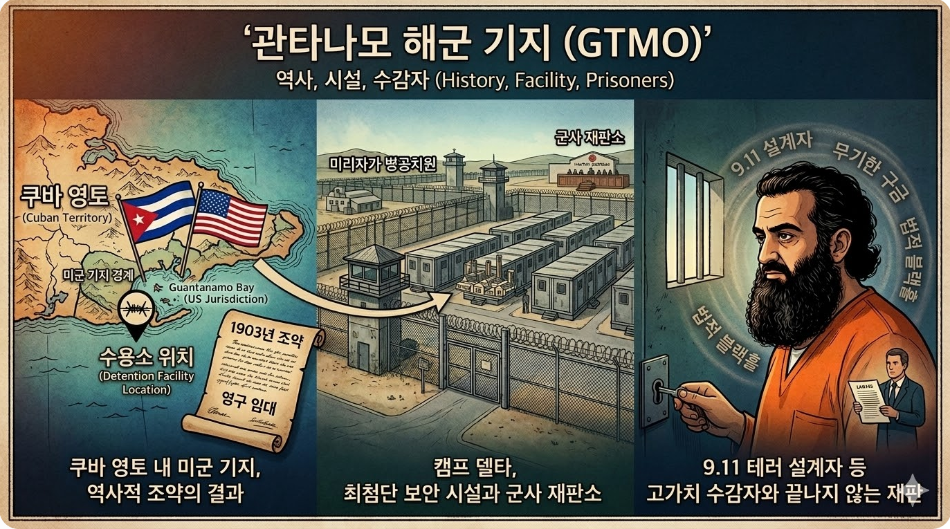 쿠바 영토 내 미군 기지인 관타나모의 역사적 배경, 시설 현황, 그리고 9.11 테러범을 포함한 주요 수감자 정보를 통해 왜 이곳이 21세기 법적 블랙홀로 불리는지 짚어 보겠습니다.