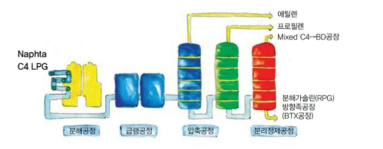 추출된 나프타는 그 자체로는 큰 쓸모가 없습니다. 이를 산업적으로 가치 있는 기초 유분으로 재탄생시키기 위해서는 NCC(Naphtha Cracking Center, 나프타 분해 시설)라는 거대한 설비를 거쳐야 합니다. 이 공정은 나프타를 800도 이상의 고온에서 열분해하여 화학 결합을 끊어내는 핵심 과정입니다. 이 단계에서 에틸렌, 프로필렌, 부타디엔, 그리고 벤젠, 톨루엔, 자일렌(BTX)과 같은 기초 유분들이 쏟아져 나옵니다. 특히 에틸렌은 '석유화학의 에센스'라 불릴 만큼 그 활용도가 압도적이며, 한 국가의 석유화학 산업 규모를 가늠하는 척도가 되기도 합니다.