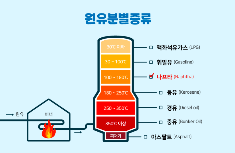 나프타의 탄생은 거대한 정유 공장의 상압증류탑에서 시작됩니다. 수입된 원유를 가열하면 끓는점에 따라 다양한 유분이 분리되는데, 나프타는 대략 30도~에서 200도사이의 온도 구간에서 추출되는 액체 상태의 혼합물을 말합니다. 이 구간에서 나오는 유분 중 끓는점이 낮은 것을 경질 나프타(Light Naphtha), 상대적으로 높은 것을 중질 나프타(Heavy Naphtha)로 분류합니다. 경질 나프타는 주로 석유화학 원료로 사용되며, 중질 나프타는 개질 공정을 거쳐 휘발유의 원료나 방향족 화합물을 생산하는 데 쓰입니다.