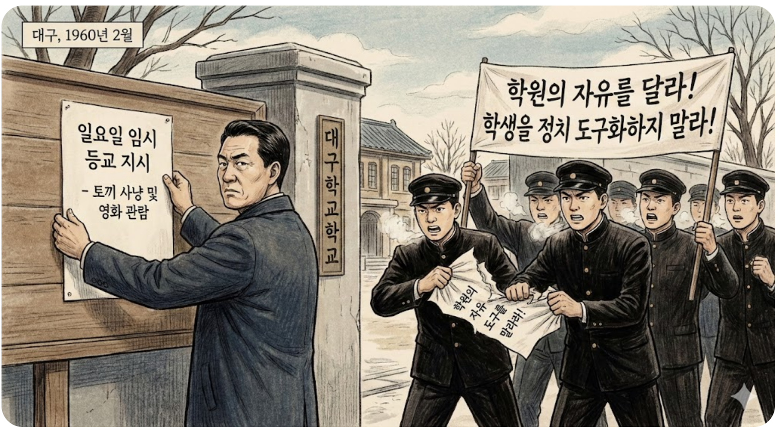1960년 당시 대한민국은 3월 15일로 예정된 정·부통령 선거를 앞두고 극심한 혼란과 부정부패에 신음하고 있었습니다. 이승만 정권과 자유당은 권력을 연장하기 위해 온갖 비합리적인 수단을 동원했고, 민심은 이미 싸늘하게 식어 있었죠. 특히 2월 28일은 대구에서 야당 부통령 후보였던 장면 박사의 선거 유세가 예정되어 있던 날이었습니다. 정권은 시민들과 학생들이 그의 강연을 듣고 깨어나는 것을 극도로 두려워했습니다. 그래서 내놓은 대책이 참으로 치졸했습니다. 대구 시내 고등학생들에게 유세장에 가지 못하도록 일요일임에도 불구하고 전원 등교 지시를 내린 것입니다.