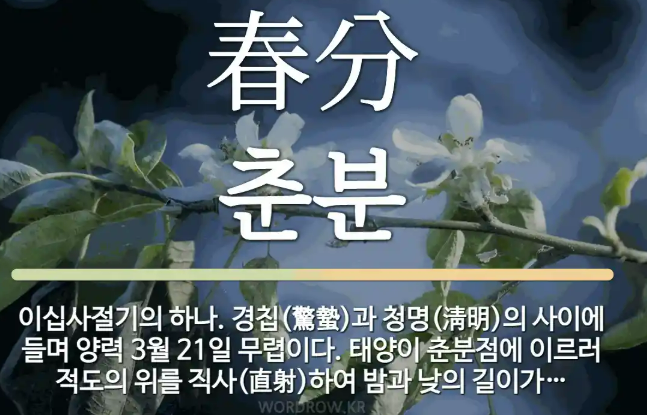 - 춘분은 낮과 밤의 길이가 같아지는 시기로 본격적인 파종이 시작되며, 날씨 점치기와 공동체 음식을 나누는 문화가 있었습니다.